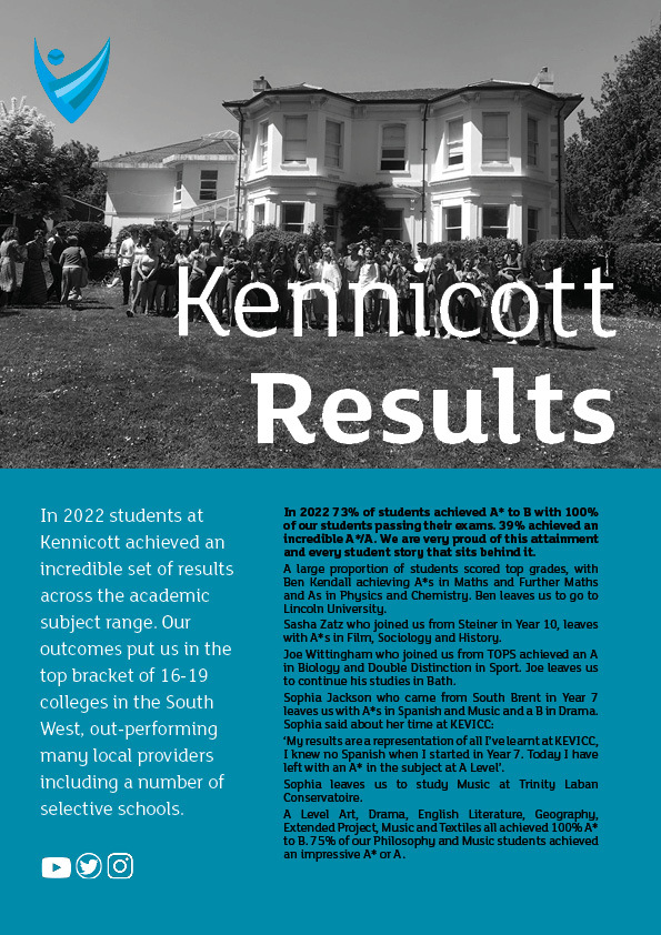 Students had much to be proud of and the achievements of every student is celebrated. Head of Sixth Form, Amy Withers comments: ‘Behind every set of outcomes there is a story; every student has worked hard to overcome challenges and to grow both personally and academically during their time at Sixth Form. Today is the culmination of that determination and effort, which it has been a privilege to be a part of. My very best wishes go to all of our students as they move forward to their next steps.’Daisy Johnson will be heading to the University of Cambridge, to study Natural Sciences and achieved A* grades in Biology, Chemistry and Mathematics as well as an A grade in Further Maths and EPQ; Anna Jones will be studying History at University of Liverpool, having achieved an A* in Sociology, A in English Literature and B in History; Kassia Panitzke-Jones takes up a place at the University of Exeter to study English and History and achieved A grades in English Literature, Philosophy and EPQ and a B in History. Kassia says ‘I am so pleased to have spent the last 2 years at Kennicott. The teachers are so very supportive and lovely. My classmates have been wonderful too. I will miss it all so much!’James Waddell commented that ‘Kennicott is a really great college and I’m really grateful to have been supported to get to university.’ James will be studying Politics at Oxford Brookes University.Holly Whittles achieved AAB in English Literature, Art and Sociology. Charlotte Lewis, Jack DeVere and Sasha Barrett secured Double Distinction Stars in their applied Sports course, and will be studying at Plymouth Marjon and Loughborough.Kennicott prides itself on being more than just a place to study. Set in a unique and inspiring environment, it offers a caring, student-focused community where students are known and supported as individuals. With strong personal tutor relationships, excellent teaching, and a culture of high expectations, students are empowered to achieve their potential—whether heading to university, apprenticeships, creative industries or employment.Following an Ofsted inspection this year, inspectors noted that pupils and sixth-form students are proud to attend King Edward VI Community College and that the school has worked hard to create a community where pupils feel they belong. They alsocommented on how the school community has been built on a foundation of kindness and respect.Alan Salt, Principal at KEVICC said:“It’s a real pleasure to celebrate with our Sixth Formers today. Their results are a reflection not only of their commitment and resilience, but also the support, care and quality of education they’ve received at Kennicott. We’re proud to have helped so many of them secure exciting futures, whether at university, in employment or further training. Kennicott is a truly special place, and these outcomes speak for themselves.”Matthew Shanks, CEO of Education South West said:“Huge congratulations to the students at Kennicott who received their A-Level results today. Their achievements are a testament to their effort and the excellent support they’ve received. It’s fantastic to hear about the diverse range of next steps our students are taking and we wish them every success on their journeys ahead.”